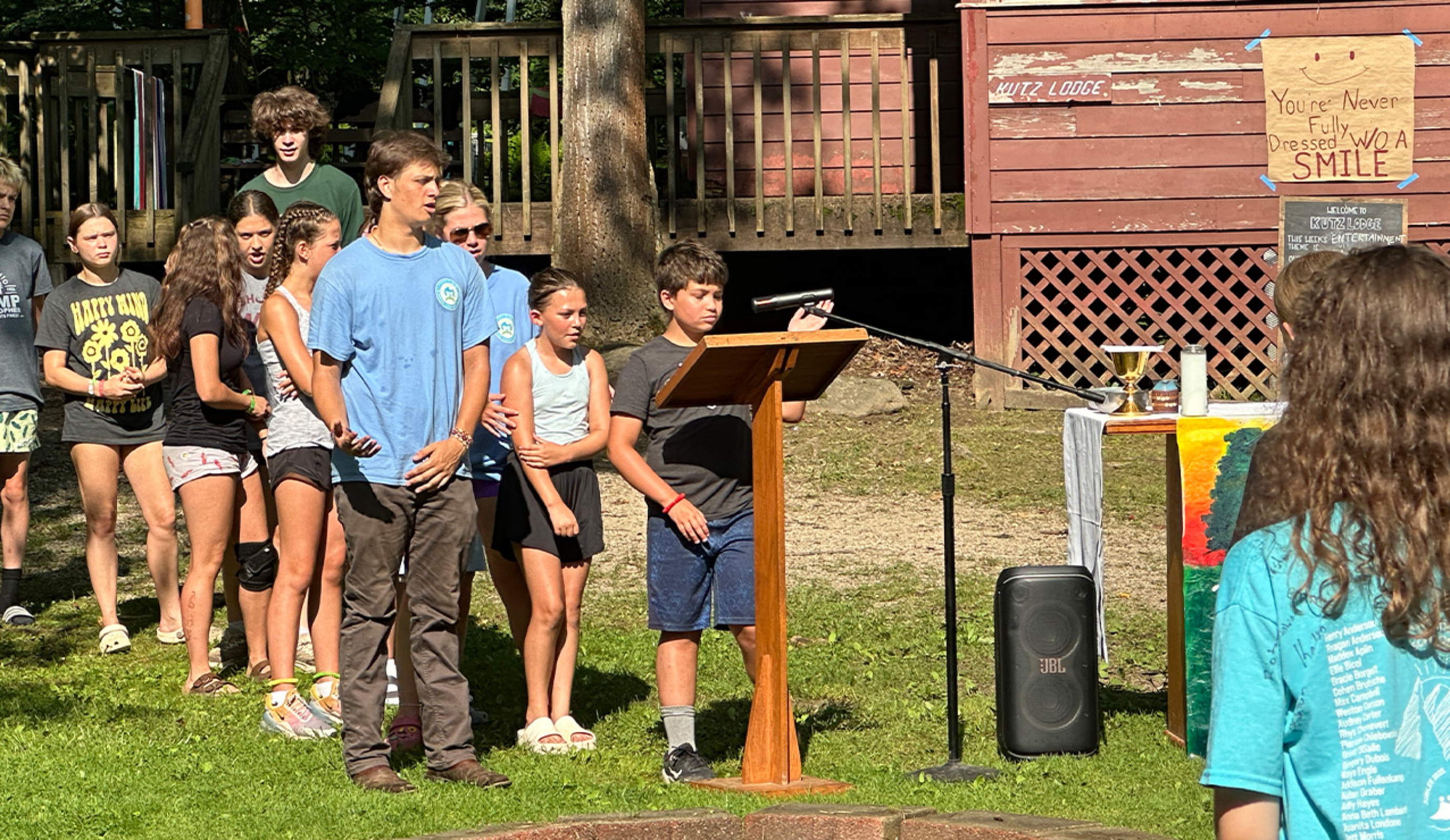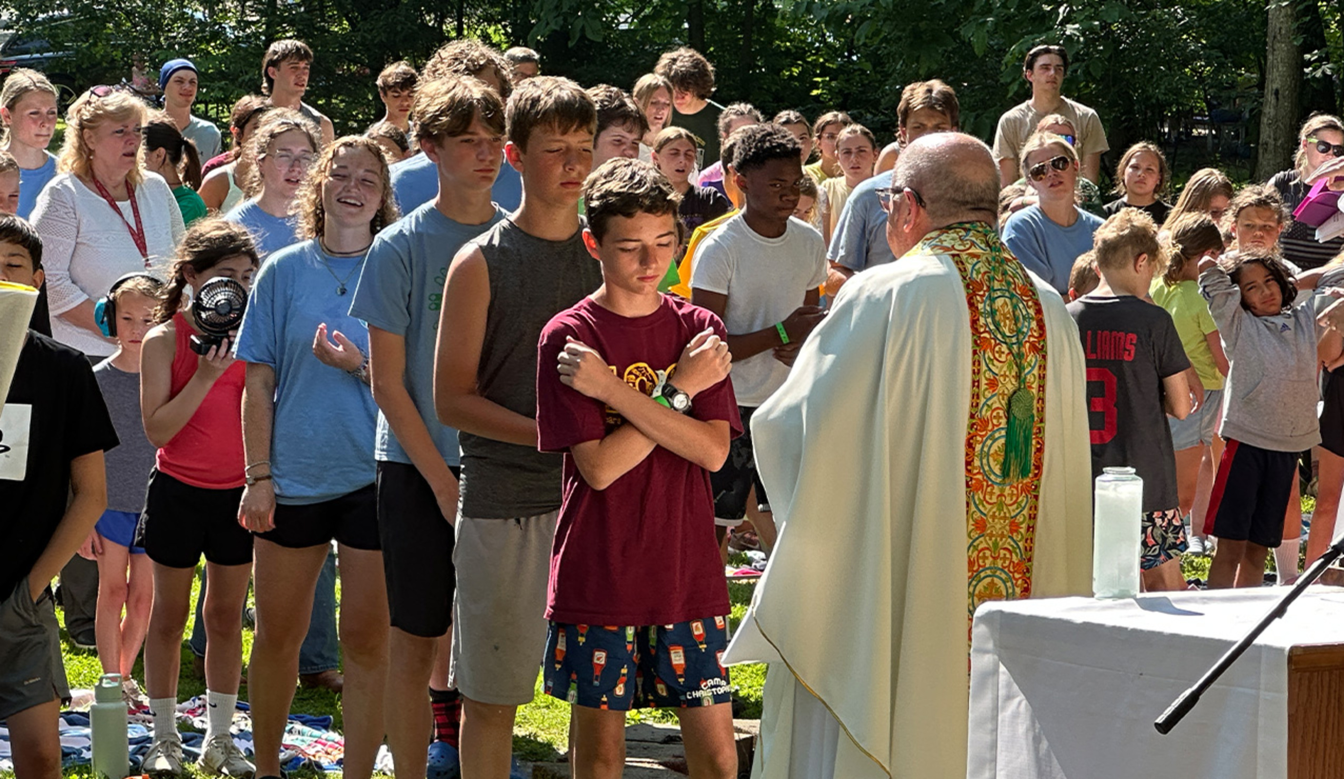 It was sunny and steamy as campers found their places on benches and blankets prior to the liturgy. Father Eric Garris, diocesan vocations director, concelebrated the Mass. Camp staff provided music and campers participated as servers. They also read the petitions.
