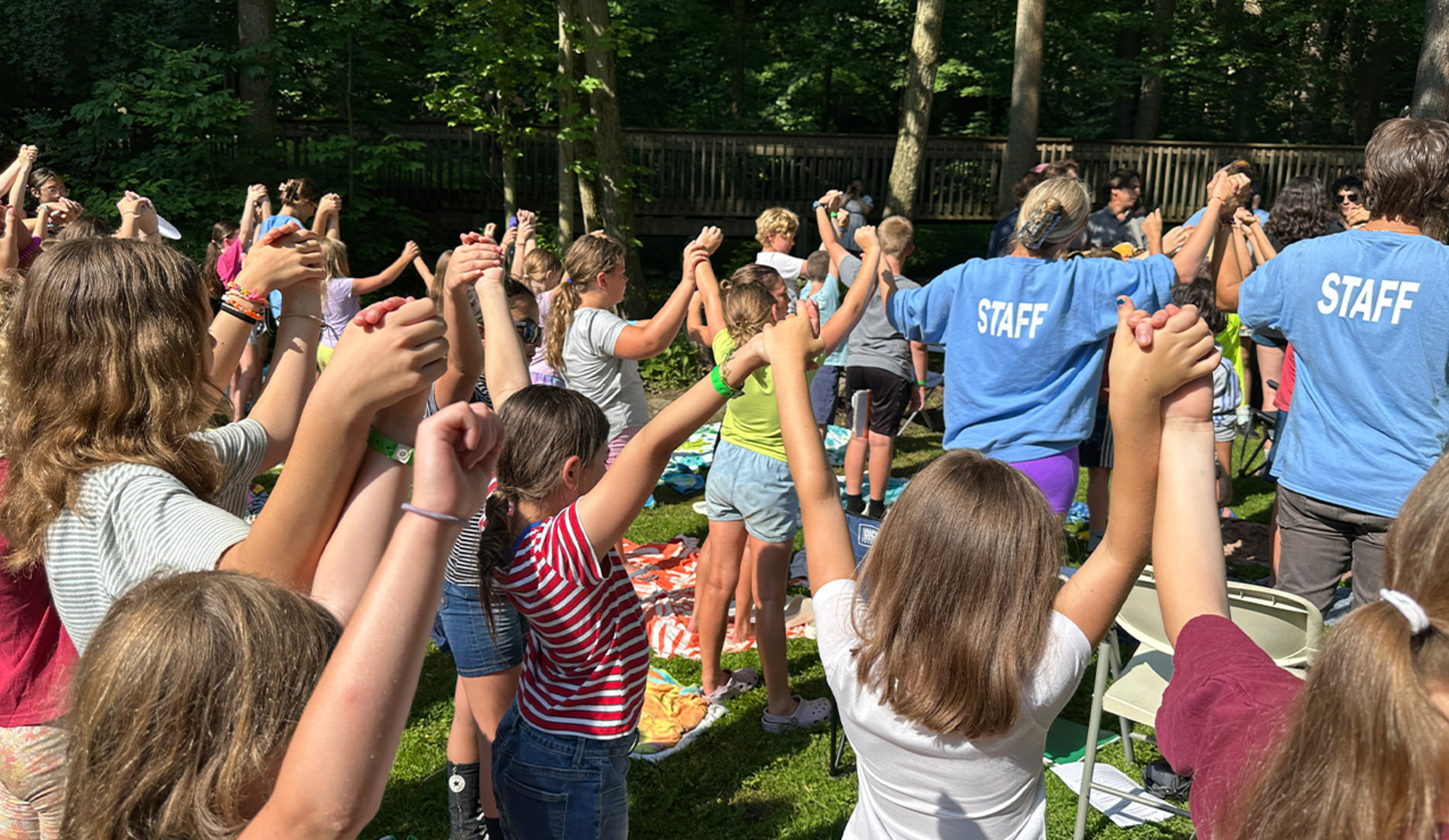 A group of campers, counselors, staff members and Catholic Charities, Diocese of Cleveland officials gathered outdoors at Camp Christopher for a Mass celebrated by Bishop Edward Malesic the morning of June 28, the Solemnity of the Most Sacred Heart of Jesus.