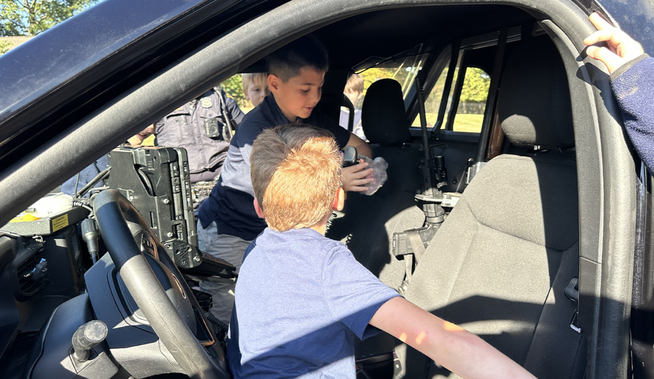 This year, CPD brought several vehicles, a robot from the bomb squad and K9 Scout to the school. They lined up in the back parking lot on the warm, sunny Friday morning as a steady stream of students visited and collected souvenir items. Among the most popular attractions were trying the intercom and siren on the police car, watching the bomb squad robot move via remote control and interacting with Scout. They also peered into the various vehicles, and some took advantage of a chance to pop their head through the opening in the roof of the SWAT vehicle.