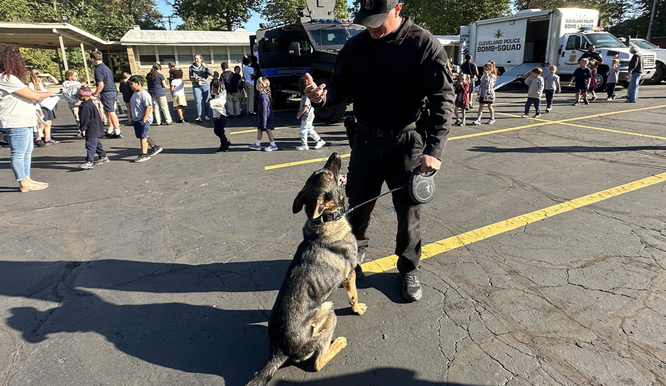 Older students paired up with their younger “buddies” to visit first responders and interact with Scout, a Cleveland Police Department K9.