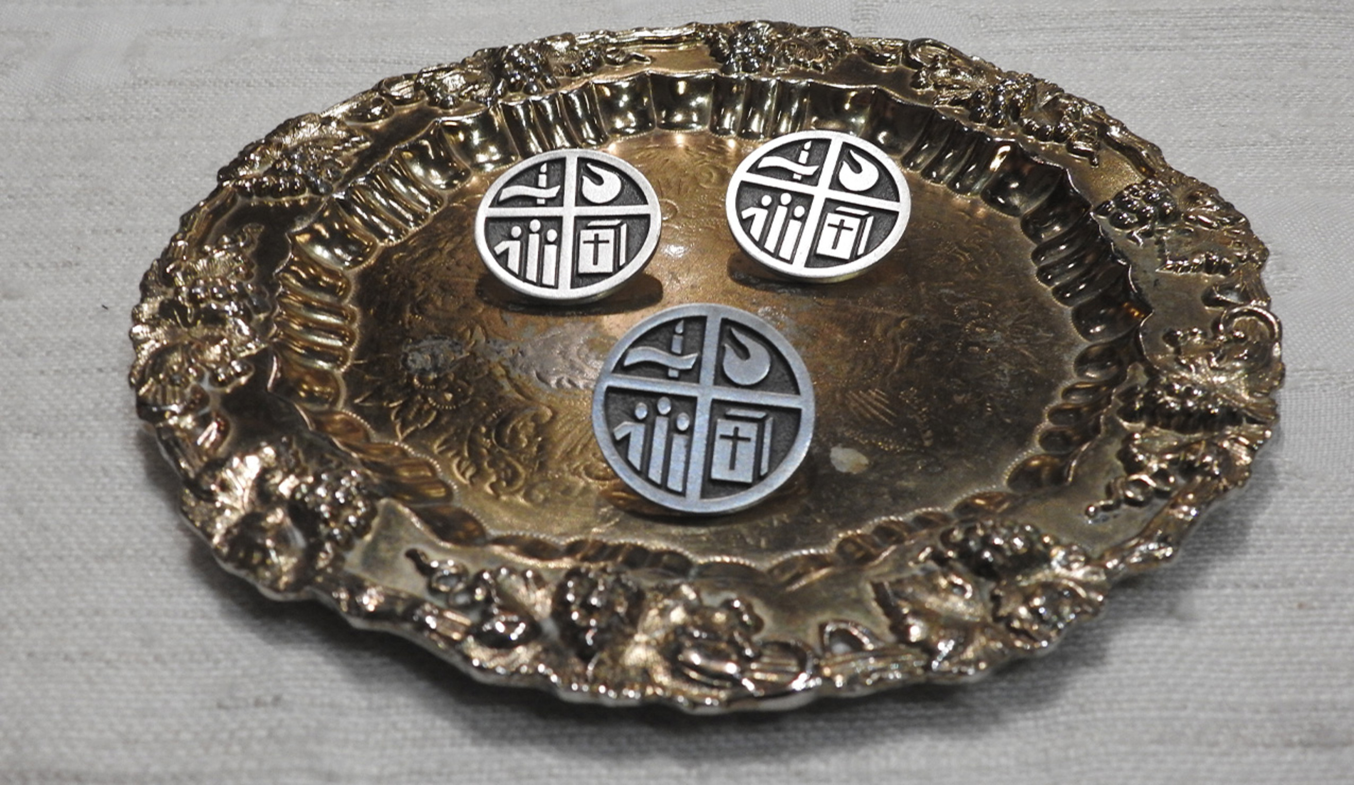 Each new minister received a pin with the LEM symbols — water and a candle, fire/spirit, people of God and the cross — that Bishop Malesic blessed.