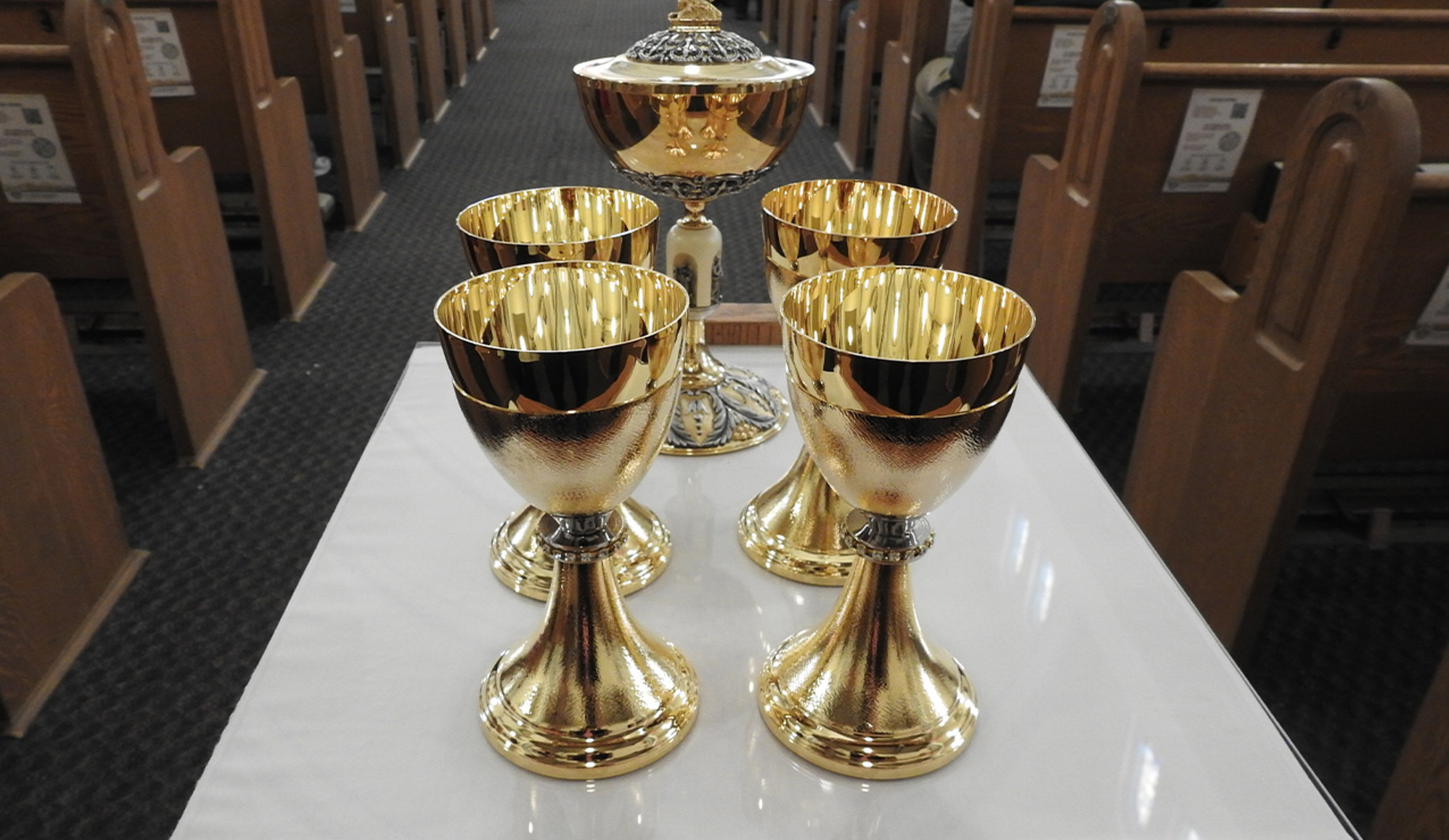 The bishop blessed a set of new sacred vessels – a ciborium and four chalices – that were purchased in Italy during an anniversary pilgrimage. The vessels, which were used for the first time at the Mass, were presented to the bishop by Marilyn Sgro, parish council chairperson, Jack Nunney, finance council chairperson, and Sara Golden, St. Peter School PTU president.