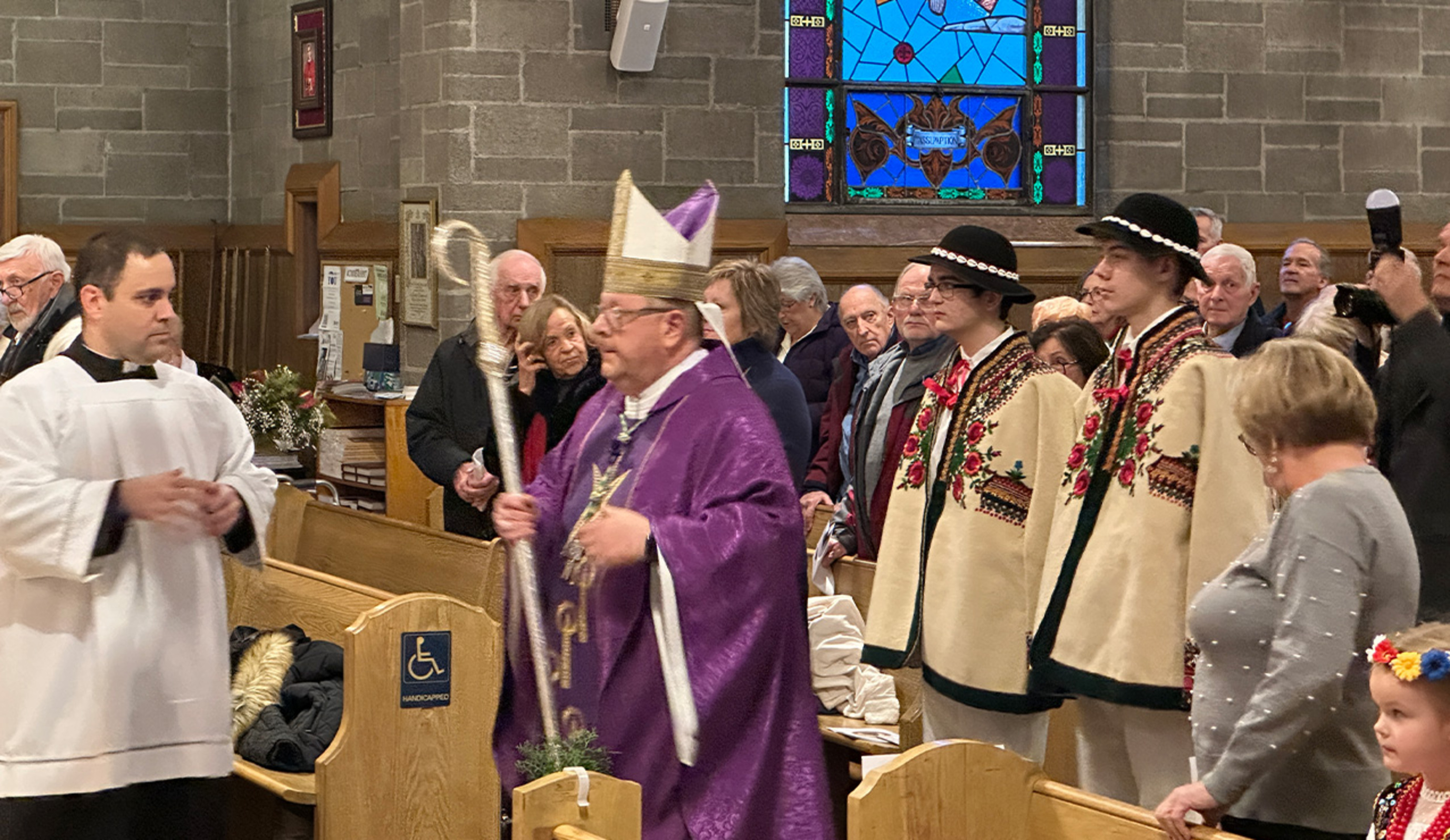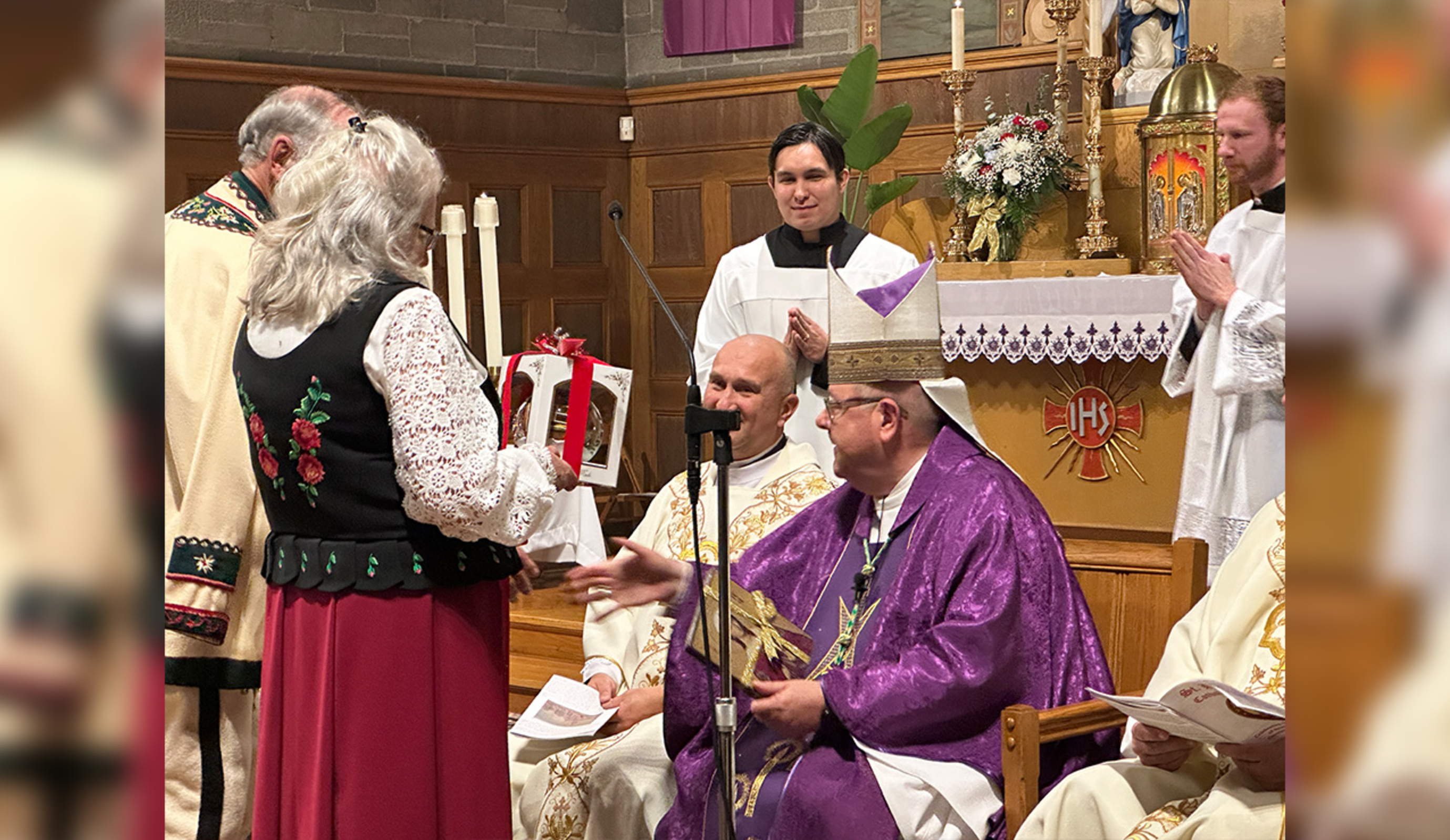 As the Mass began, parishioners – some in traditional Polish garb – presented the bishop with gifts including bread and flowers.