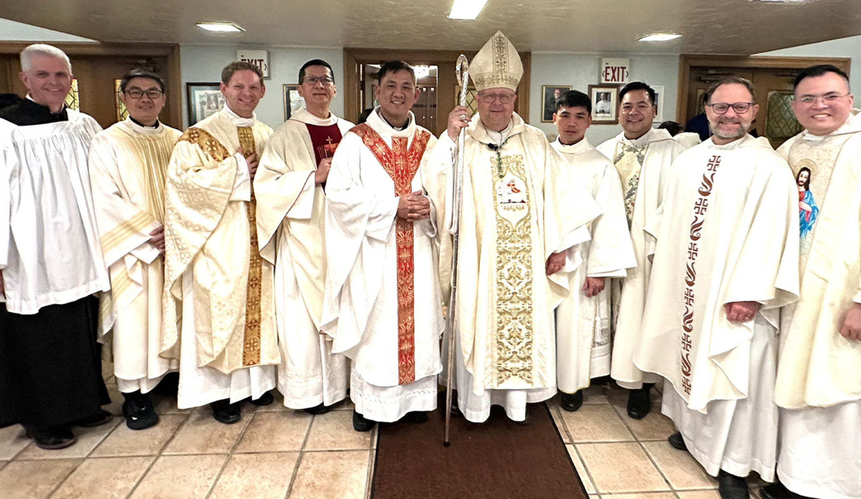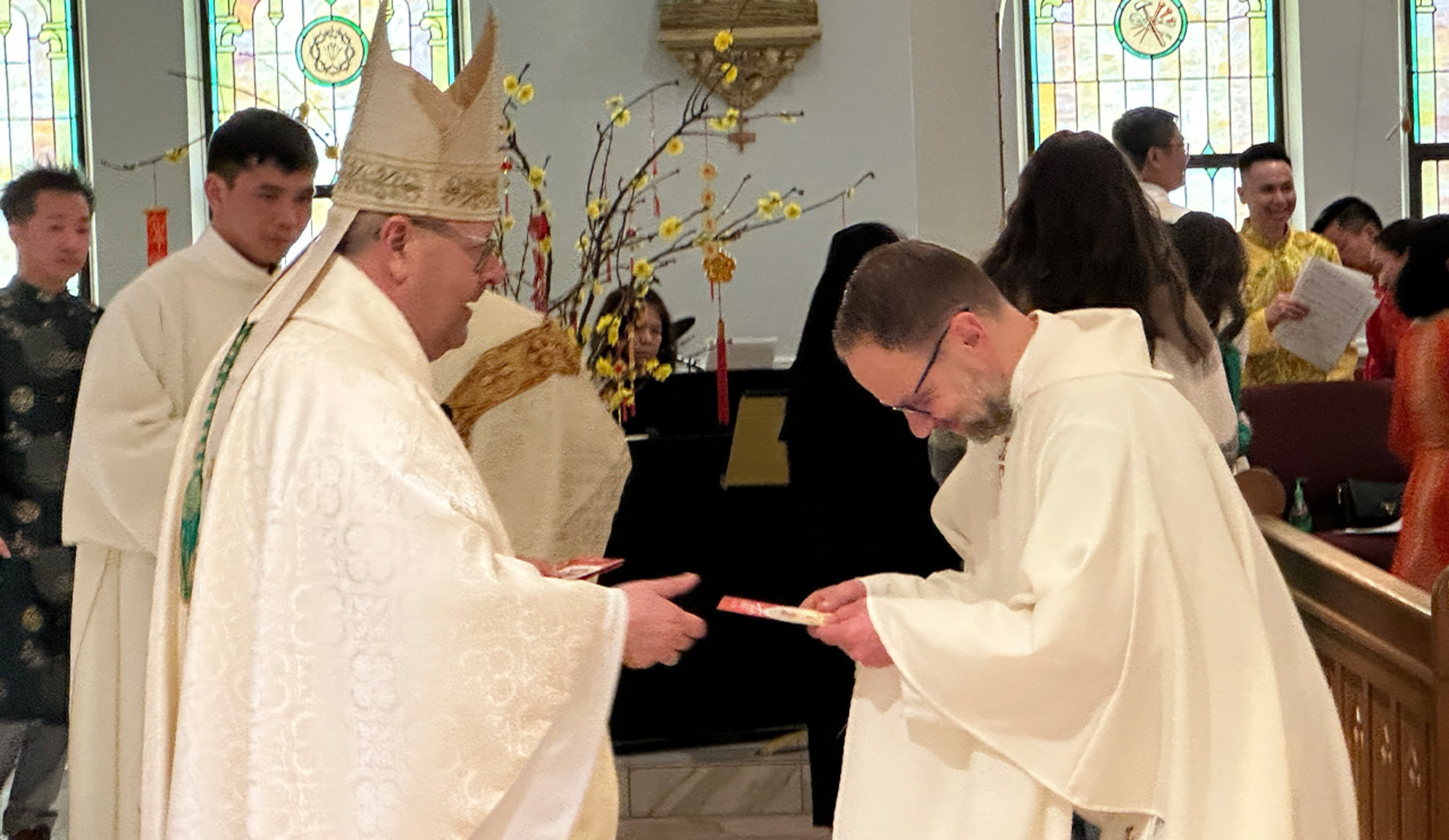 The bishop was the principal celebrant at a bilingual thanksgiving and peace prayer Mass in both Vietnamese and English. There were seven concelebrants, including Father Mark Minh Dao, St. Boniface pastor, and Father Damian Ference, diocesan vicar for evangelization. Deacon Truong “Joseph” Viet Ho, who is preparing for priestly ordination in May, assisted with the liturgy and translated the bishop’s homily into Vietnamese.