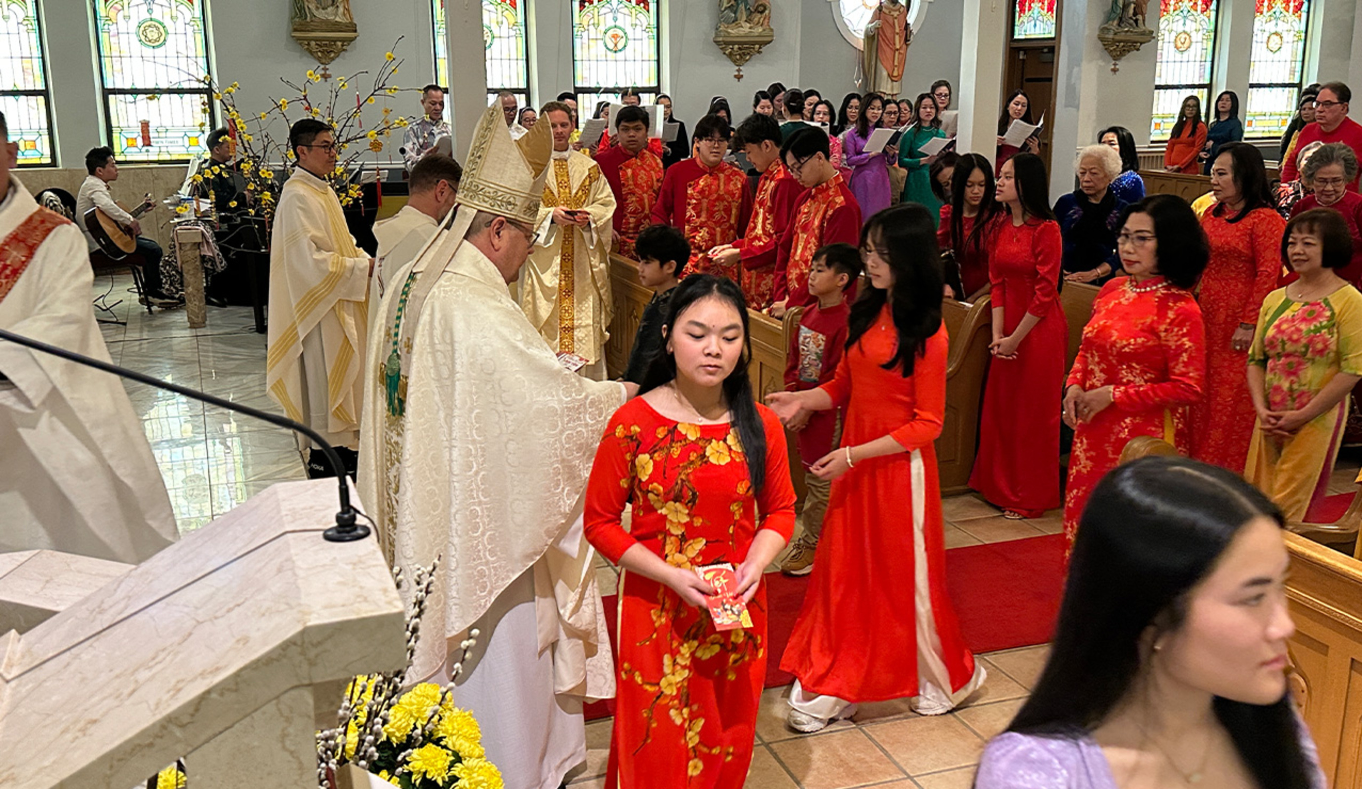 The Vietnamese American Apostolate at St. Boniface Parish in Cleveland observed Tet, the lunar new year, by welcoming Bishop Edward Malesic on Feb. 15.
